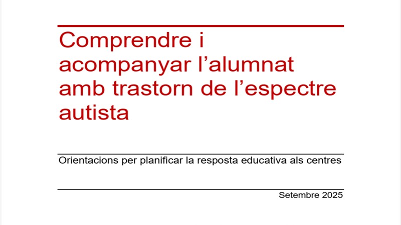 El Departament d’Educació i Formació Professional ha publicat una guia per ajudar els centres educatius a acompanyar l’alumnat amb trastorn de l’espectre autista (TEA). El document, titulat ‘Comprendre i acompanyar l’alumnat amb trastorn de l’espectre autista. Orientacions per planificar la resposta educativa als centres’, ha comptat amb la col·laboració d’entitats com la Societat Catalana de Pediatria, Aprenem Autisme, Federació Catalana d’Autisme, i diversos centres educatius i de recursos, com centres d’educació especial, de desenvolupament infantil i atenció precoç (CDIAP) o escoles bressol.
